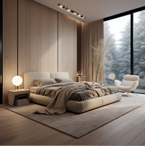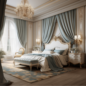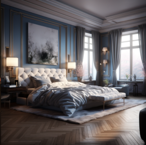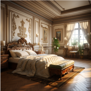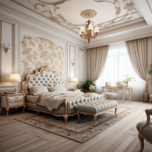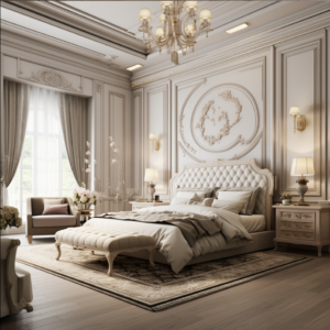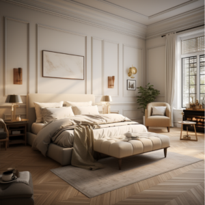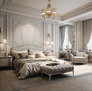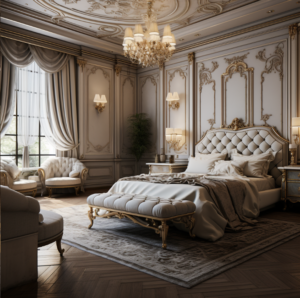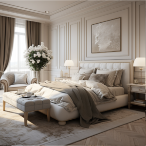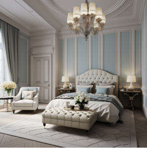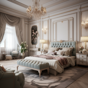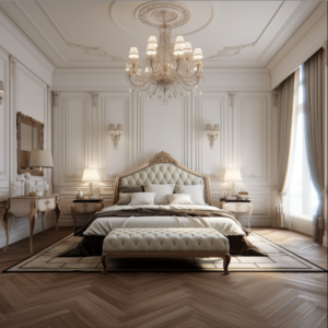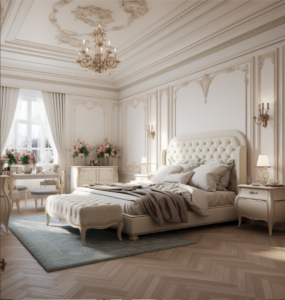 - Klasyczna Elegancja: Jasne, pastelowe kolory, eleganckie meble i delikatne dodatki tworzą harmonijną przestrzeń. Drewniane meble, subtelne tkaniny i stonowane dodatki nadają sypialni elegancki charakter.
